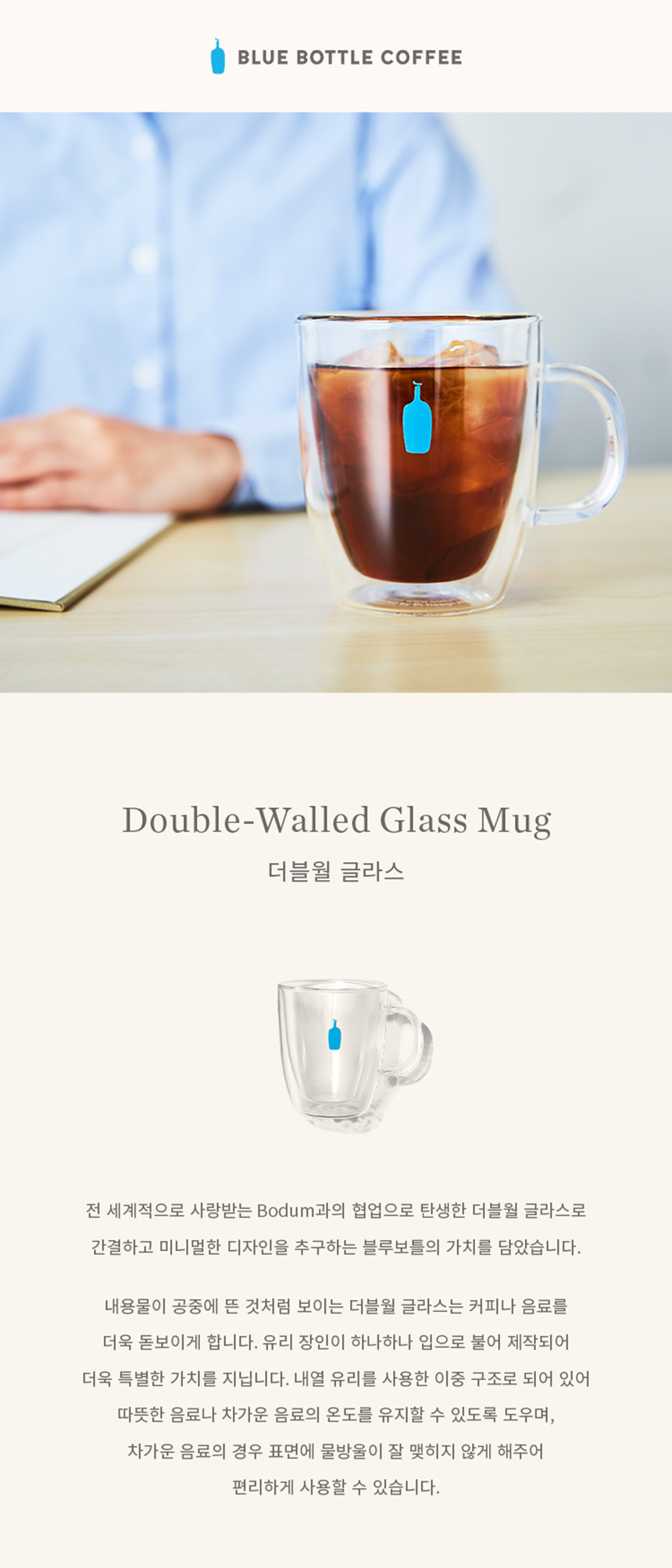- 與國際知名品牌 Bodum 共同設計,結合 BLUE BOTTLE COFFEE 簡約且富有現代感的設計理念。